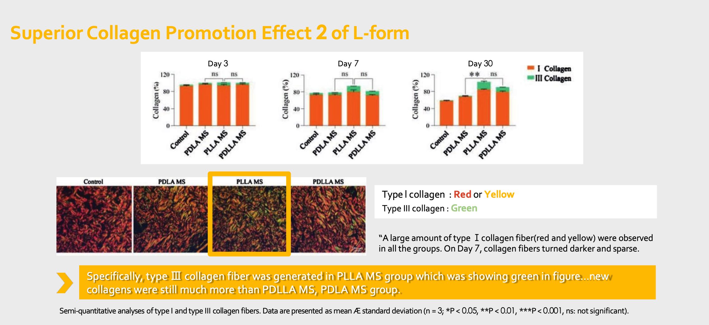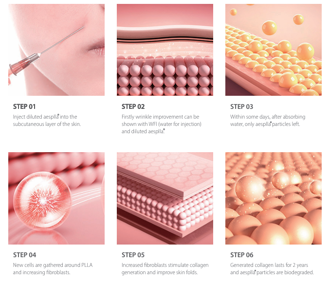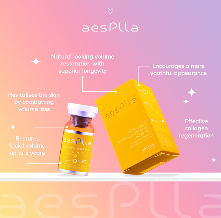 aesPLLA® je určený na stimuláciu kolagénu a dlhodobé omladenie pleti. PLLA sa už viac ako 20 rokov využíva v medicíne pre dlhotrvajúce zlepšenie kontúr tváre – s výsledkami viditeľnými už od 4 týždňov a trvácnosťou až 3 roky. Preukázaná stimulácia a tvorba dlhodobého kolagénu Typu III