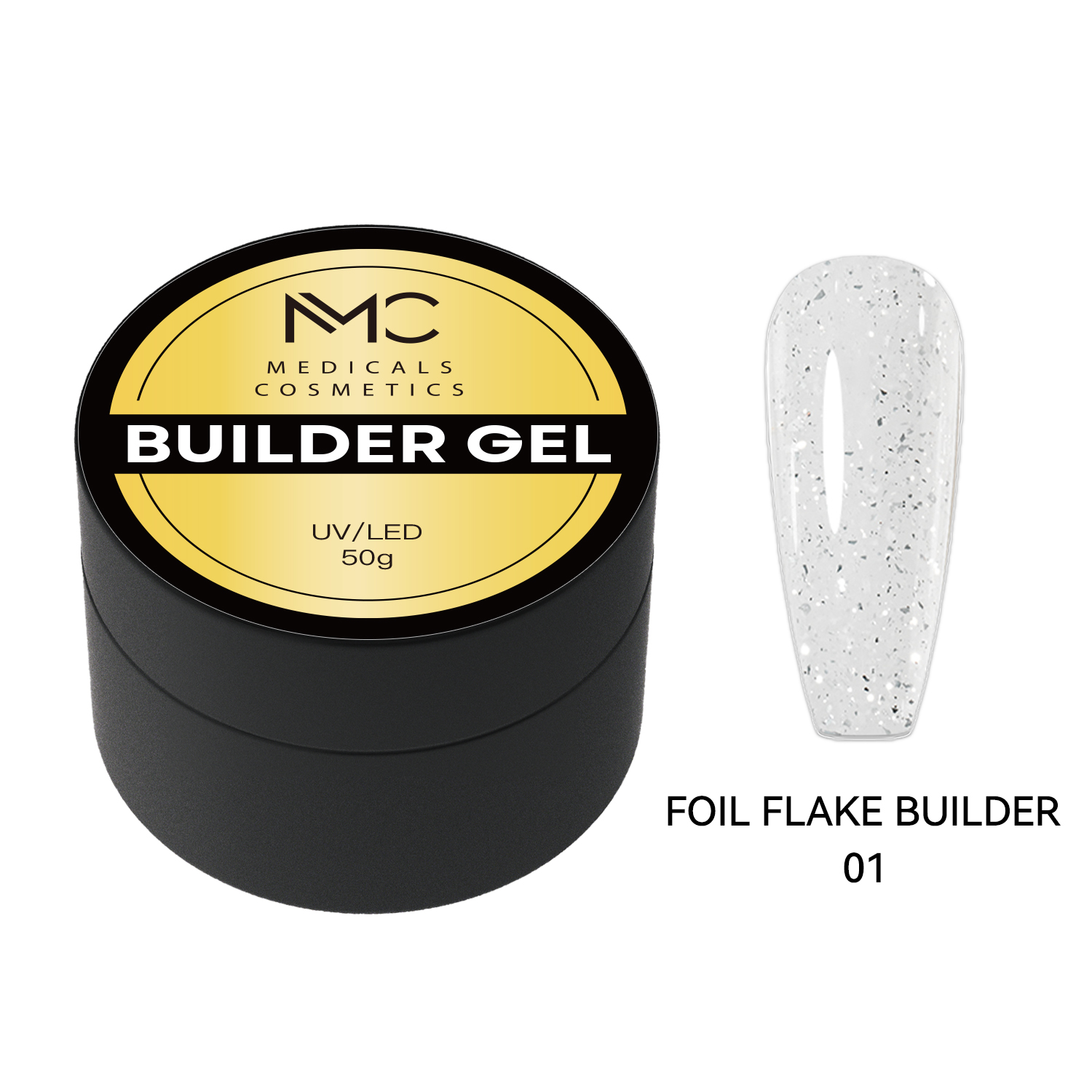 MC Builder Gel Foil Flake 01 – Prémiový stavebný (builder) gél na spevnenie a modeláciu nechtov. Transparentná báza s dekoratívnymi fóliovými vločkami vytvorí čistý, šperkovo lesklý efekt už v samotnej modelácii – ideálny na natural look, francúzsku manikúru aj pod nail art.