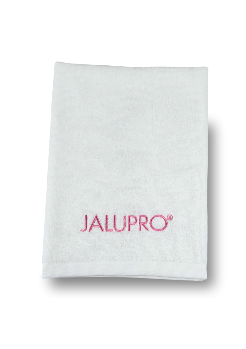 TOWEL JALUPRO SMALL, WHITE WITH PINK LOGO