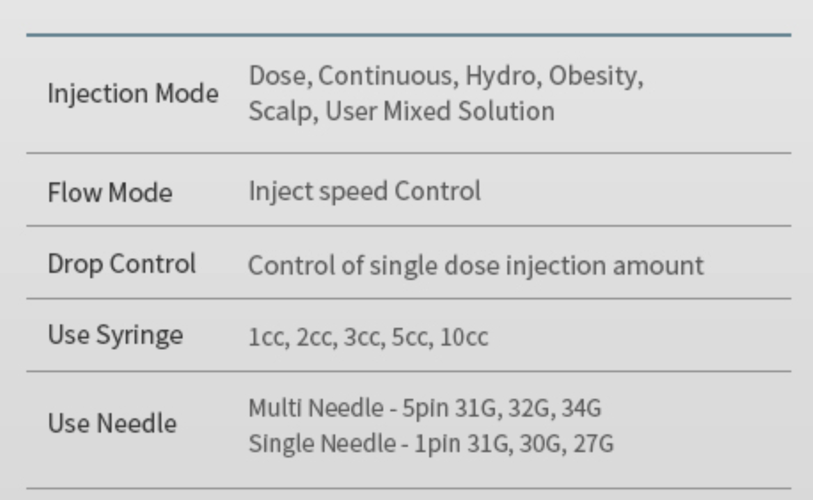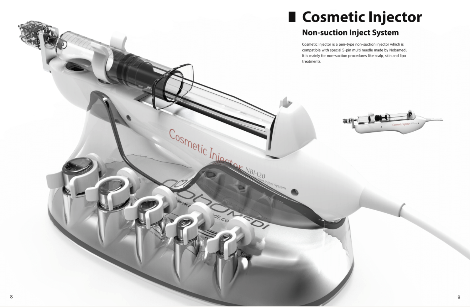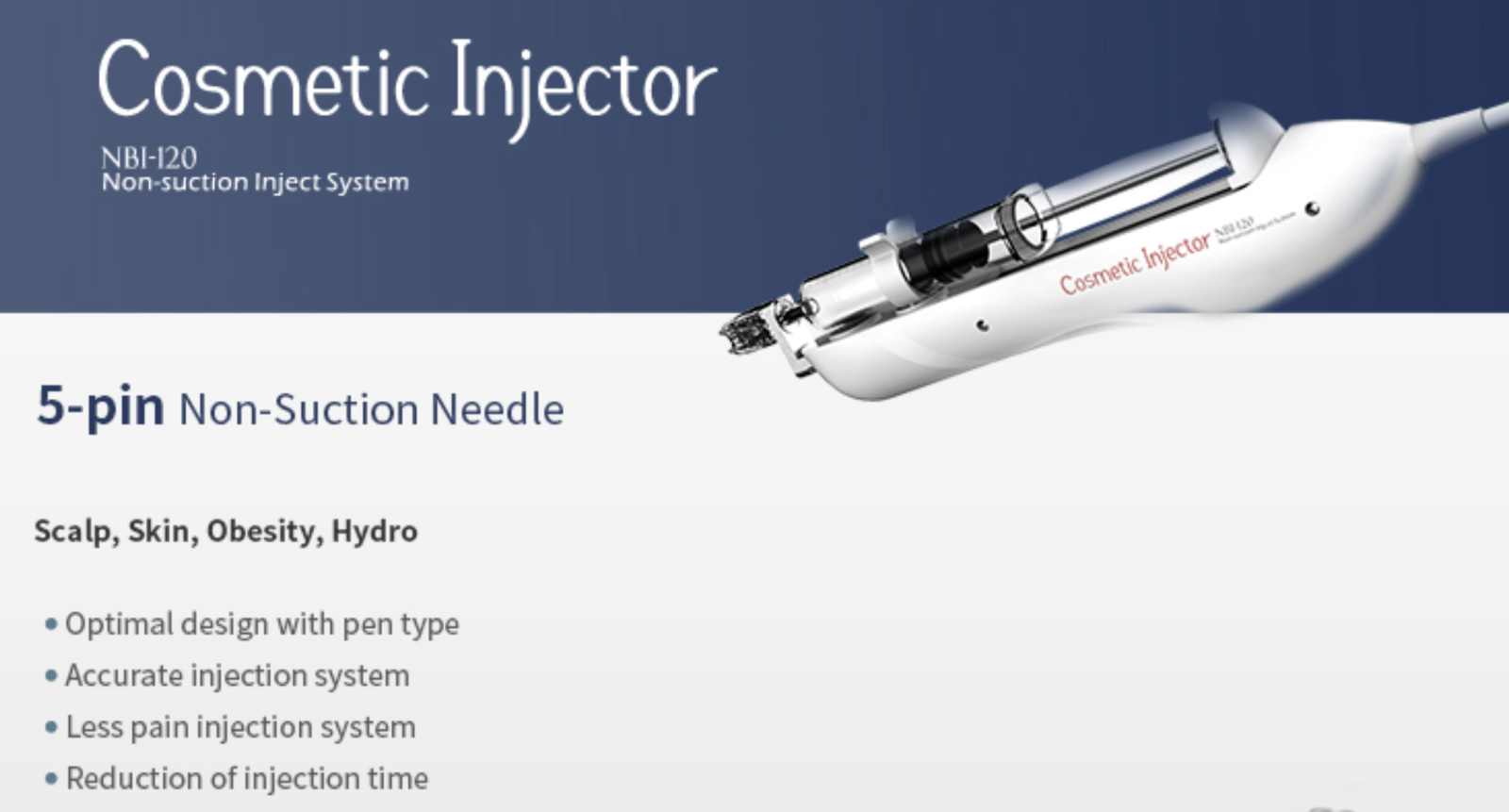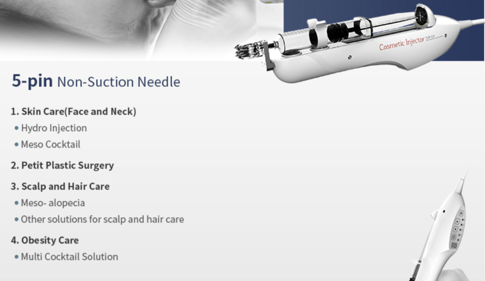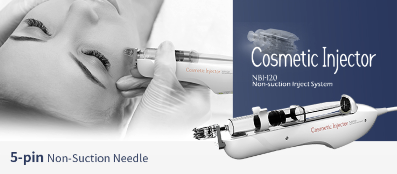 Kozmetický injektor je typ injektora bez nasávania, ktorý je kompatibilný so špecializovanou 5-kolíkovou multiihlou od spoločnosti Nobamedi. Môžeme aplikovať ošetrenia tváre a pokožky hlavy.