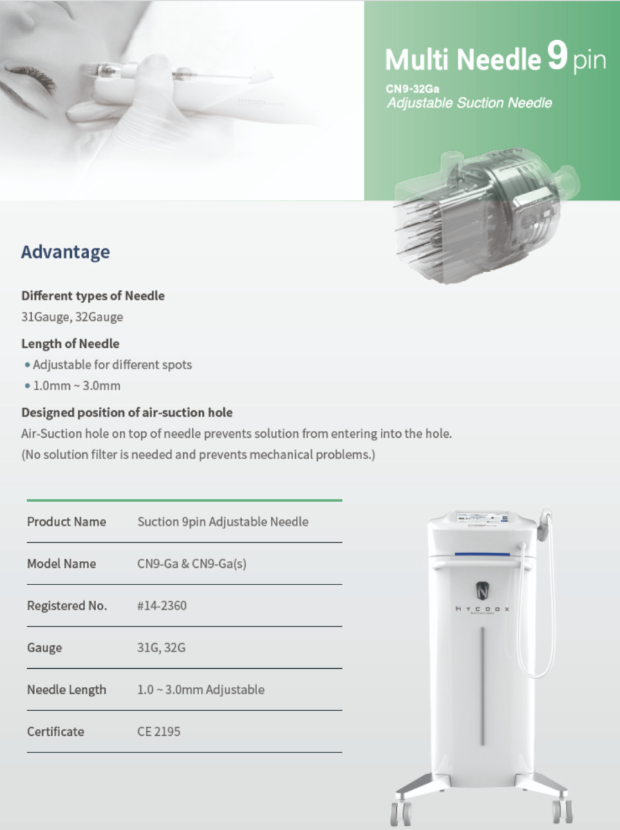 Automatický sací systém HYCOOX je najpokročilejšou technológiou v estetickom priemysle. Akonáhle je 9-ihlová multiihla aplikovaná do pokožky pomocou sacieho tlaku a senzor v zariadení rozpozná, že ihla je vložená správne, potom automaticky vstrekne roztok bez použitia akéhokoľvek tlačidla alebo nožného spínača.