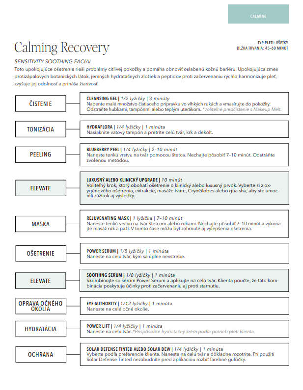 Protokol začína šetrným čistením a tonizáciou, ktoré rešpektujú citlivú pokožku. Nasleduje jemný peeling, ktorý podporuje obnovu buniek bez podráždenia. Kľúčovým krokom je aplikácia upokojujúcich sér a masiek, ktoré redukujú zápal, posilňujú kožnú bariéru a zvyšujú odolnosť pleti voči vonkajším stresovým faktorom.