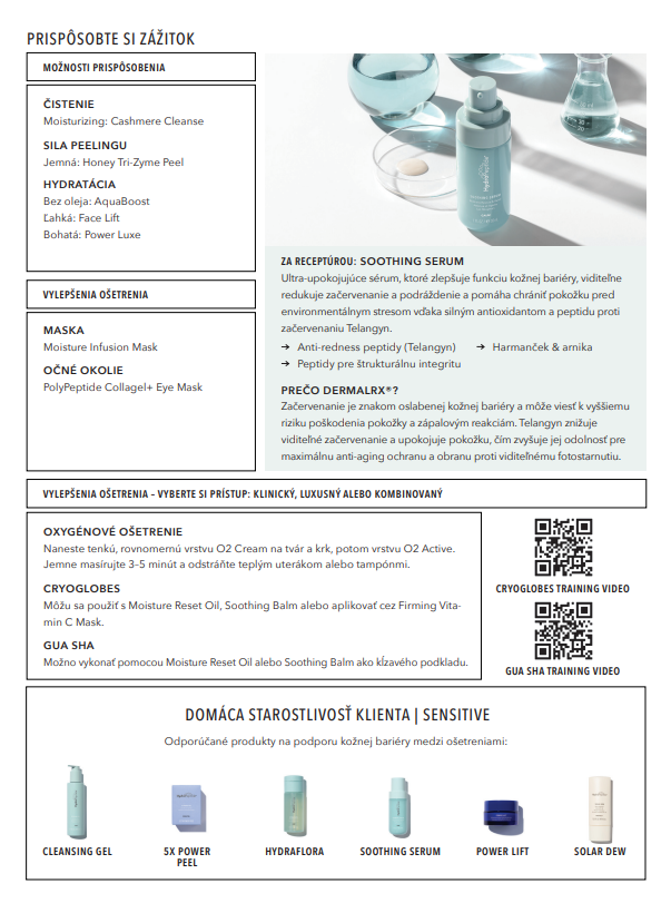 Ošetrenie je možné prispôsobiť individuálnym potrebám klienta pomocou doplnkových techník, ako sú oxygenačné ošetrenia, CryoGlobe masáž alebo jemná gua sha, ktoré podporujú mikrocirkuláciu a zvyšujú komfort pokožky.