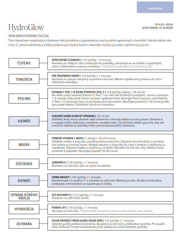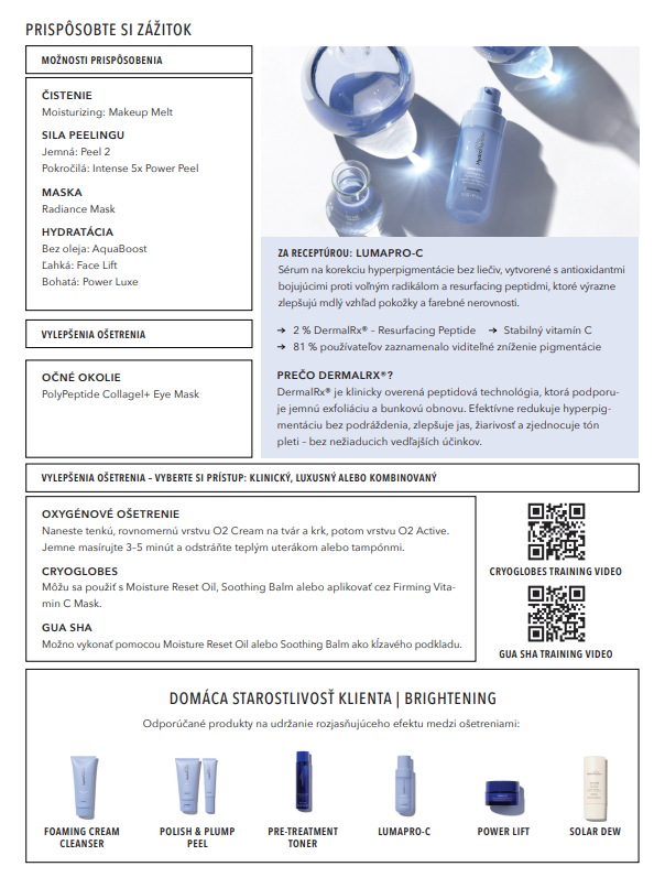 Ošetrenie je možné prispôsobiť individuálnym potrebám klienta pomocou doplnkových techník, ako sú oxygenačné ošetrenia, CryoGlobe masáž alebo gua sha, ktoré podporujú mikrocirkuláciu a zvyšujú efekt rozjasnenia.