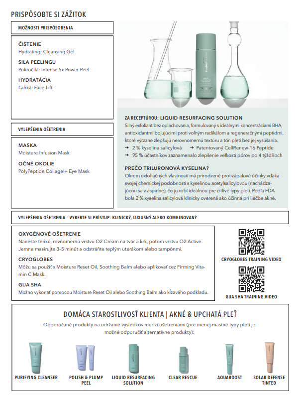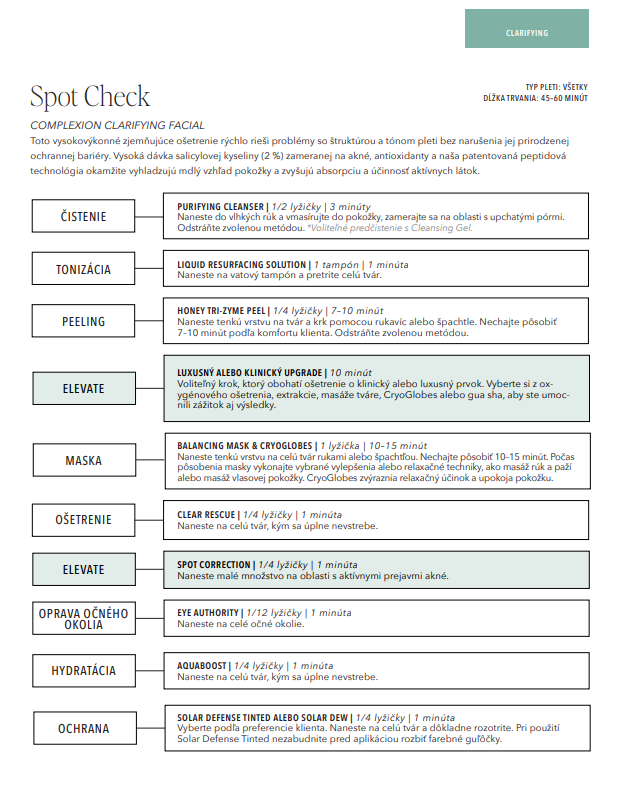 Protokol začína dôkladným čistením a tonizáciou, po ktorých nasleduje účinný peeling podporujúci obnovu buniek a odstránenie odumretých buniek. Kľúčovým krokom je aplikácia čistiacich a regeneračných sér, ktoré pomáhajú redukovať zápal, minimalizovať póry a podporovať zdravý vzhľad pokožky.