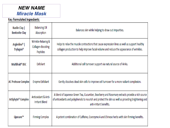 Čistí a podporuje čistotu pleti. Pomáha spevniť a tónovať pokožku. Vyživuje pokožku pomocou silných antioxidantov obsiahnutých v Miracle Mask. Vhodný pre všetky typy pleti, najmä mastnú pleť náchylnu k akné a starnúcu pleť.