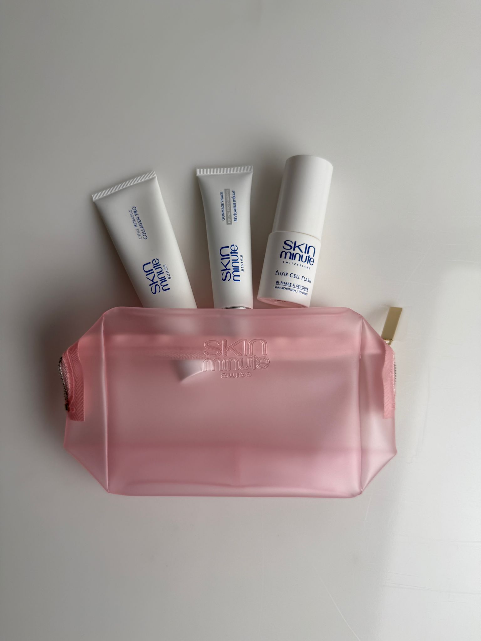 Ultra praktická a elegantná kozmetická taštička Skinminute spoľahlivo chráni vaše kozmetické nevyhnutnosti vďaka svojmu ľahkému, odolnému a vodeodolnému materiálu. Mliečno ružový povrch s matným, nepriehľadným efektom jej dodáva moderný a minimalistický vzhľad. Záverečné detaily – zlatý lesklý zips a embosované logo – prinášajú nádych luxusu a trendový štýl, ktorý robí skutočný rozdiel. Bez produktov.